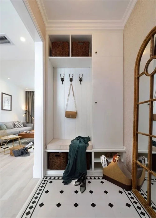 沿垂直于入戶門(mén)的墻面做一排鞋柜,要是入戶門(mén)位置到了墻角,厚度不夠的話,就選比較薄的成品鞋柜;再要不行,在墻面能敲的情況下,就敲墻吧,然后把鞋柜嵌進(jìn)去。