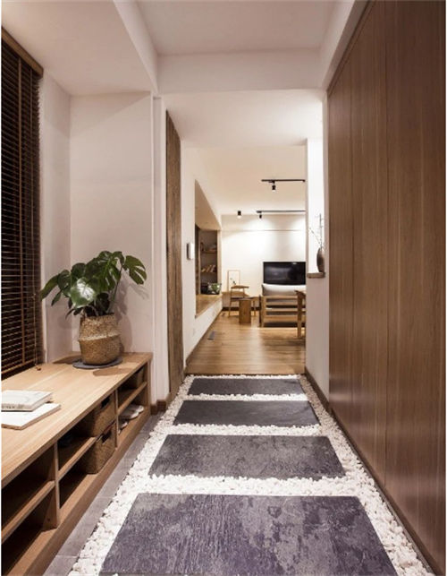 這是最常見(jiàn)的設(shè)計(jì),在進(jìn)門(mén)處有類似走廊的小空間,設(shè)計(jì)一個(gè)嵌入式玄關(guān),將其沿著墻一排擺放,收納儲(chǔ)物充足,建議設(shè)計(jì)成I型。