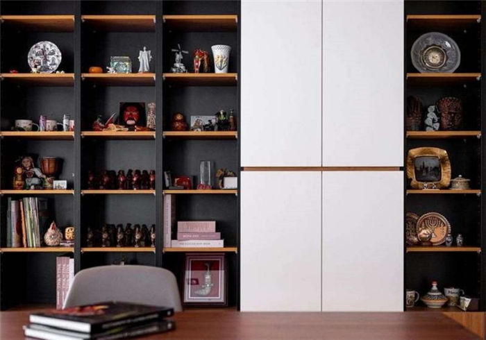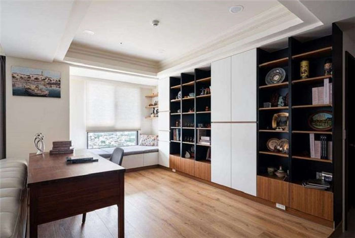 雖然去除墻面,但架高平臺(tái)讓書房仍自成一格,尤其是墻面的書柜設(shè)計(jì),以黑色背板顯示穩(wěn)重,白色密閉柜做區(qū)塊分割,柚木色的層板與下方抽屜則適時(shí)活潑跳色,充足的收納量可以擺放屋主見證人生經(jīng)歷的各種紀(jì)念品與書籍、小朋友的手作作品與童書,老人家坐在窗前臥榻閱讀,孫兒則在平臺(tái)上看書或玩玩具,時(shí)時(shí)都能照應(yīng)。