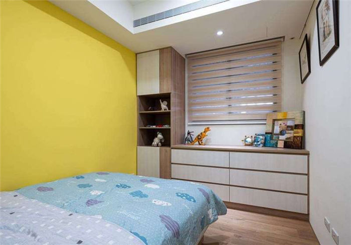 屋主也為?;啬锛业呐畠毫袅肆硪婚g主臥,優(yōu)雅的天青色背墻,以造型壁板美化,更衣室還有專設(shè)宛如明星般的梳化妝,簡直將飯店規(guī)格搬回家;兒童房則以鮮艷檸檬黃搭配雙色收納柜,尤其是不對稱的門片設(shè)計(jì),更增童趣。