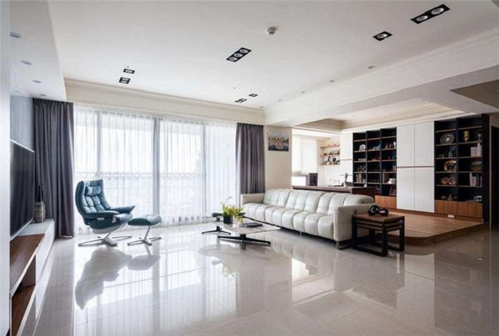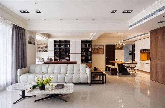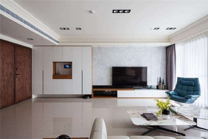 客廳大氣簡約,收納充足不做滿 屋主不喜歡太多復(fù)雜的設(shè)計(jì),因此歐德設(shè)計(jì)師葛娜麗以大理石拼貼黑鏡為客廳電視主墻,彰顯屋主的大氣品味,入口不做獨(dú)立玄關(guān),而以白色搭配柚木色的系統(tǒng)柜充實(shí)鞋子與衣物的收納,中央以中空臺(tái)面打造畫框意象,生活小物與對講機(jī)、開關(guān)彷彿都成為畫中一景。