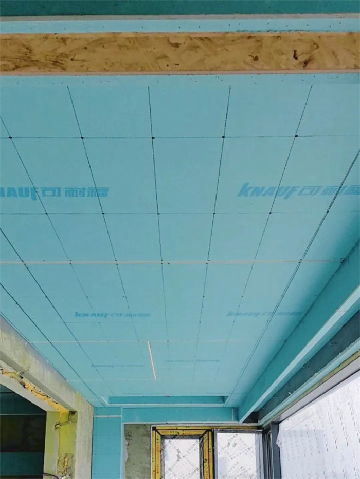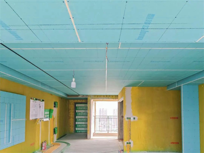 △吊頂平梁,梁下過一層石膏板,厚度10mm,縫隙用發(fā)泡膠軟鏈接,合格。