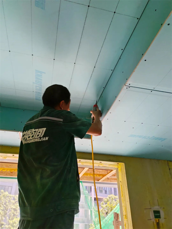 △師傅正手持電鉆固定板材,板材拼接處,縫隙控制得極為精準,每顆釘子的間距都有嚴格標準