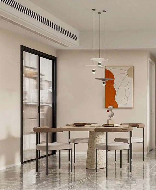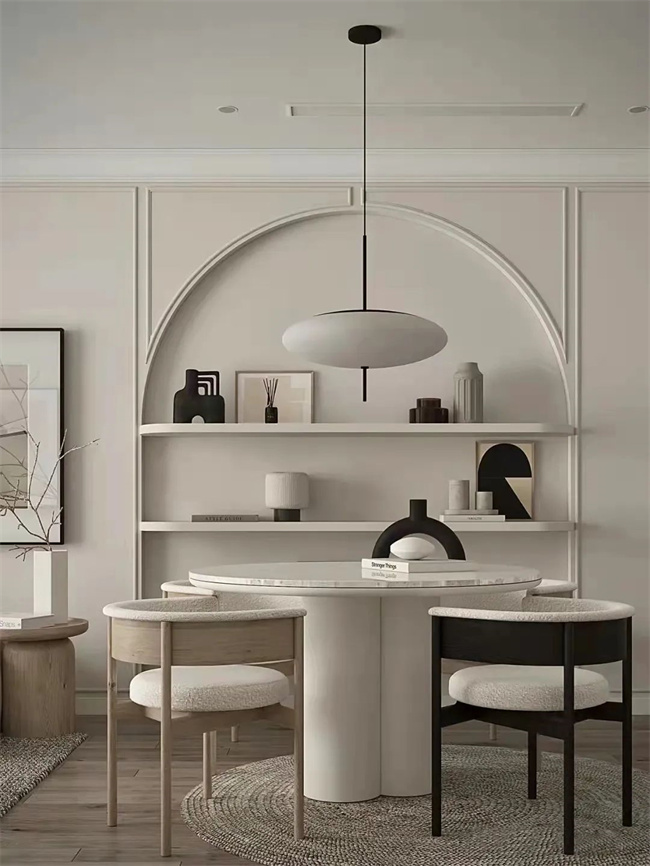 選擇內(nèi)嵌筒燈這種簡潔又提升亮度的燈具,讓天花板盡可能的簡單,空間會顯得更透亮。如果喜歡吊燈,一定要避開那些十分復(fù)雜的款式,吊燈的位置要在桌面上方290cm處,這樣才能發(fā)揮其特性,讓人感覺天花板更加遙遠(yuǎn)。