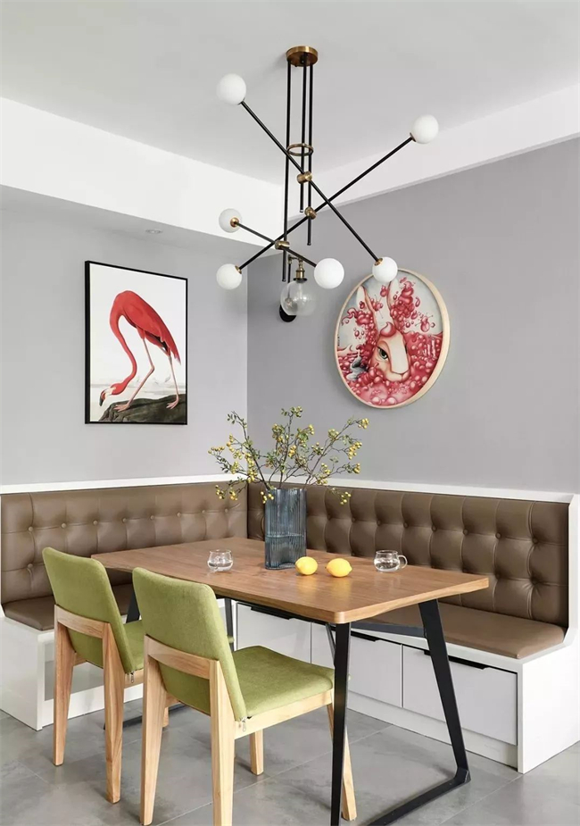 18、餐廳面積小可以用卡座設(shè)計(jì),節(jié)省空間又能增加儲(chǔ)物。