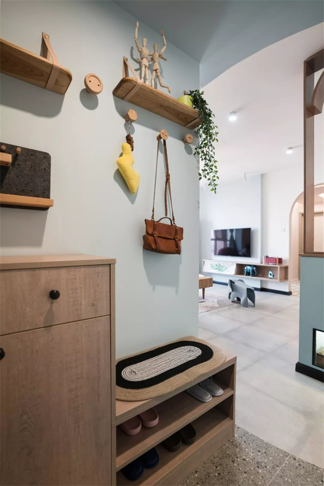 玄關(guān)處購置這樣的柜子,方便將鞋子和一些工具收納其中。不影響觀感,同時柜子中間還可以放一些進門隨手拿放的物件。
