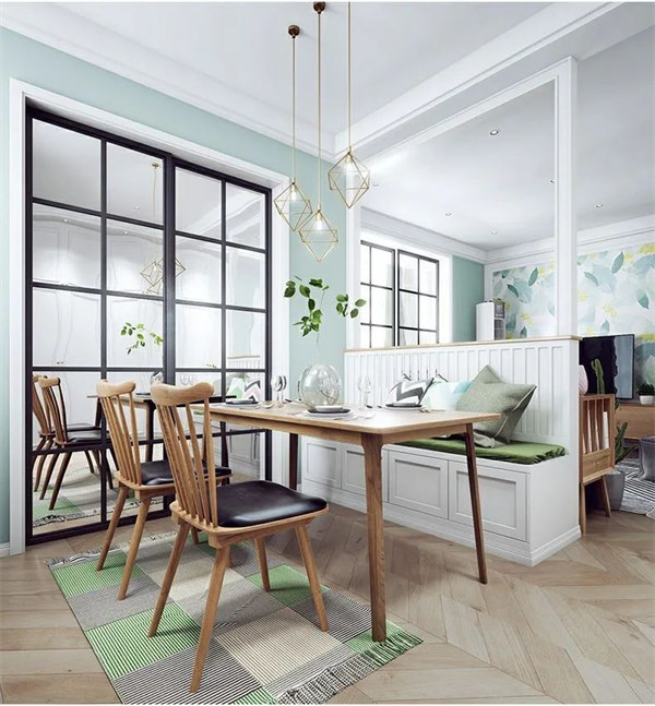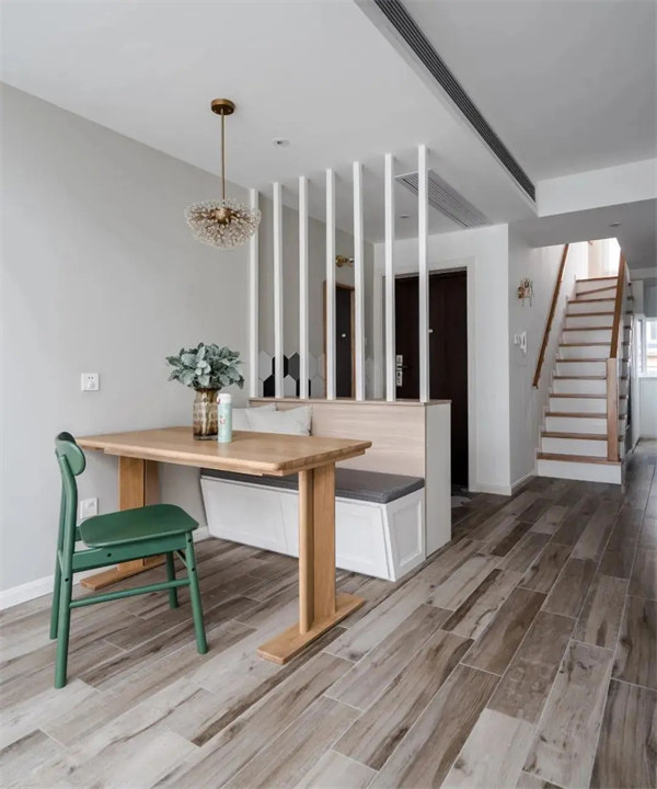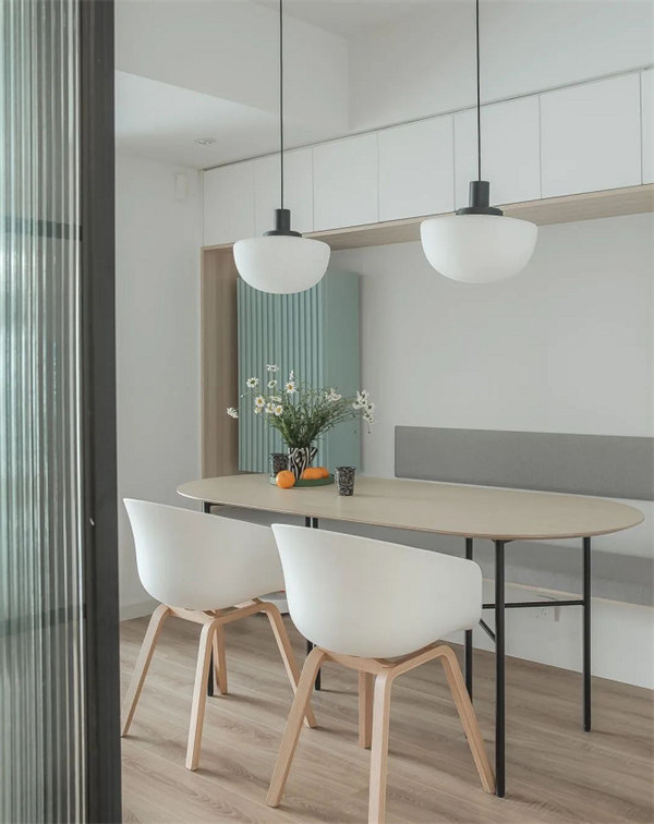 小戶(hù)型設(shè)計(jì)往往因?yàn)閾頂D給我造成壓抑的視覺(jué)感,卡座隔斷既能劃分空間,同時(shí)還不會(huì)遮擋光線,在起到隔斷空間作用的同時(shí),還能多出一個(gè)餐桌位置。配合吊燈以及桌面上的綠植,可以營(yíng)造滿(mǎn)滿(mǎn)的生活儀式感。