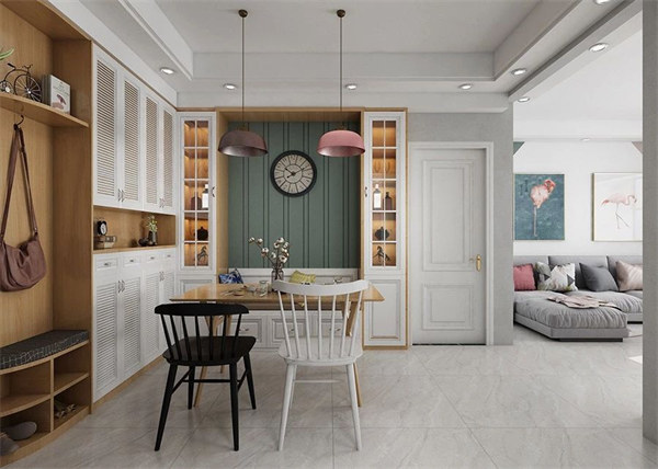 玄關(guān)設(shè)計(jì)為卡座組合柜形式,由鞋柜+卡座+衣柜組成,同時(shí)滿(mǎn)足多個(gè)功能需求,通過(guò)換鞋凳和儲(chǔ)物結(jié)合,既能充當(dāng)收納,放得了鞋子,又能方便家里的老人、小孩換鞋,同時(shí)還能巧妙地與餐廳相結(jié)合,兼顧實(shí)用性與美觀性,視覺(jué)上更有層次感,使用也更便捷。