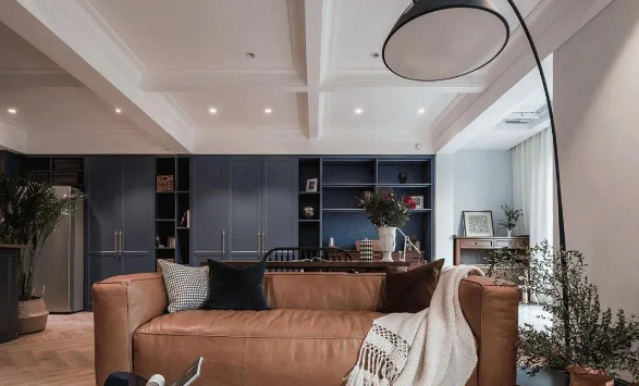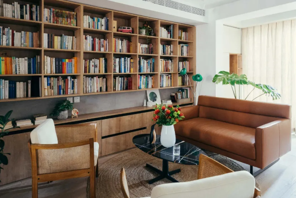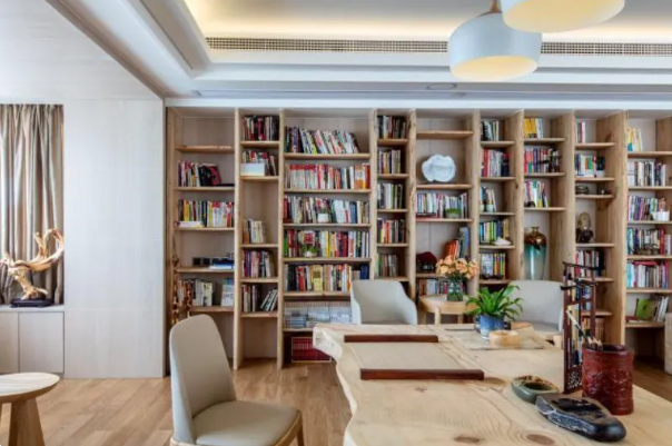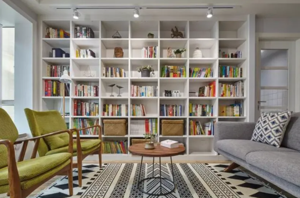 如果不是特別的藏書發(fā)燒友,客廳整面書柜完全可以兼具收納柜的功能。一半藏書,一半藏雜物。藏書的部分可以做出開放格或者玻璃門;而收納雜物的部分可以采用柜門遮擋。既美觀又實(shí)用。