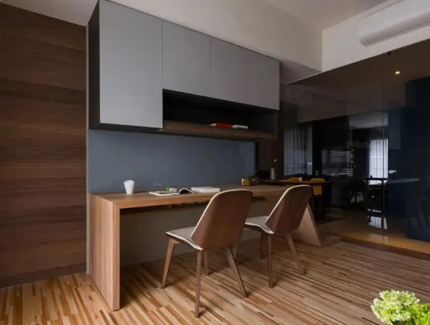 傳統(tǒng)的沙發(fā)布局,入座后面朝的是電視機(jī)。人和人雖然離得很近,但是卻缺乏溝通??蛷d書房一體化的設(shè)計(jì),以書桌為空間核心。讓一家人有了更多面對面而坐的時(shí)間。想一想,你多久沒有和伴侶、孩子促膝長談了?!
