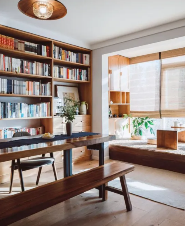 但是,今天給大家安利一款打破常規(guī)的客廳布局——將書房搬到客廳的一體化設(shè)計(jì)!即在客廳空間里打造一整面墻的書柜&收納柜,再放一張大大的手工桌??磿?、做作業(yè)、喝茶都能滿足。