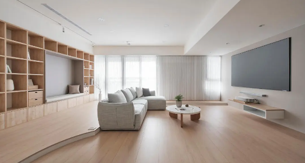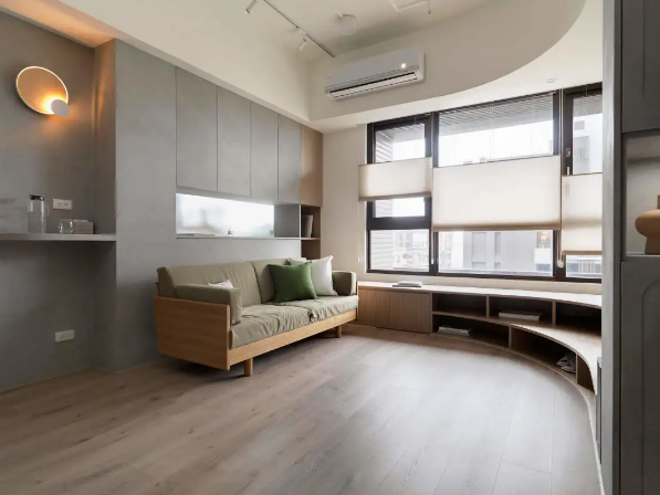 如果是小戶型的橫廳,想改造一個休閑小酌區(qū)域,我們可以將沙發(fā)靠墻,設(shè)計雙層地臺開放格間,既可以當(dāng)做儲物收納的柜子,地臺與基礎(chǔ)地面形成的高度差可以增強(qiáng)視覺層次感,豐富整體空間的視覺效果。