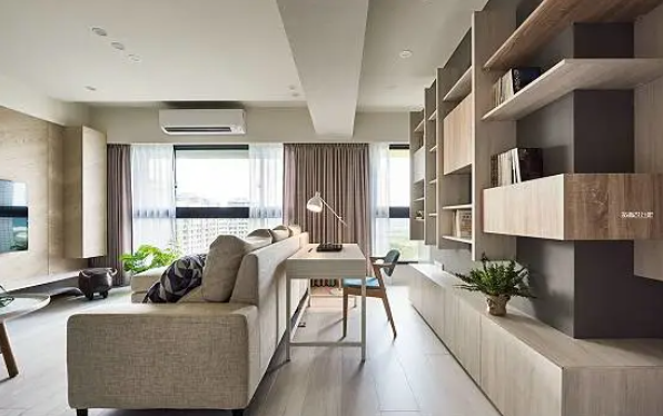 在橫廳中,只需在沙發(fā)后面增加書柜+書桌椅,這樣一個開放式的工作區(qū)域就落地了,當(dāng)你一邊工作一邊看到窗外大面積的綠景時,心情愉悅絕對會大大增加,因為橫廳中的采光和視線,都非常明朗開闊!