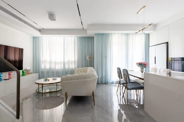 一般常規(guī)布局即是客廳+餐廳的設(shè)計,如果空間足夠,還可加裝島臺,讓餐廳的功能更加完善。