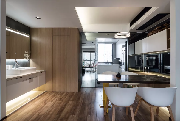 餐廳一側(cè)就是洗手盆,側(cè)邊的木飾面打造的墻體裝上一個(gè)隱形門,潔凈的洗手盆結(jié)合木質(zhì)感的空間,在燈光的修飾裝扮下,顯得充滿了精致的層次感,同時(shí)臨近餐廳的洗手盆,讓在餐前飯后都可以方便地洗手,養(yǎng)成良好的習(xí)慣。