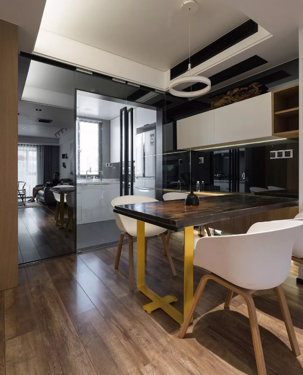 餐廳廚房之間的玻璃推門,與餐廳背景墻的黑色鋼化玻璃,還有一套現(xiàn)代舒適的餐桌椅,搭配顯得格外的現(xiàn)代時(shí)尚。