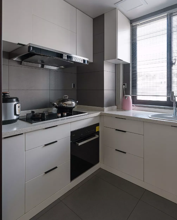 廚房以白色櫥柜門板,搭配黑色的電器,還有灰色的墻面磚,裝扮出一個(gè)現(xiàn)代時(shí)尚的空間感。