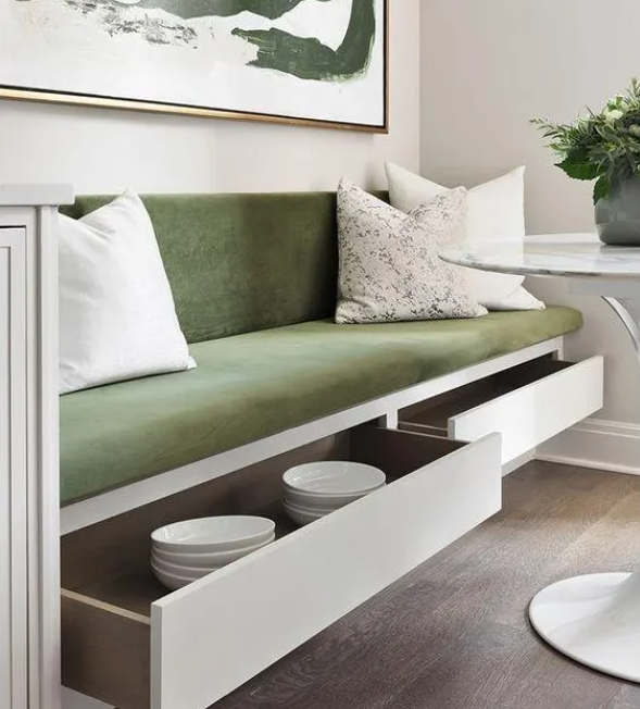 卡座的儲物主要是在座位下面,一般會做抽屜或者柜格,可以朝前、朝上、側(cè)邊、留空等,但建議大家別做正面拉的抽屜,因為會被餐桌阻擋,拿取物品不方便。