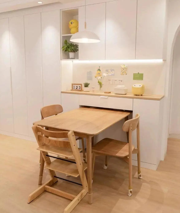 很多小戶型的餐廳都小,放下一桌四椅后過道又變窄了,這時候選擇設(shè)計卡座最合適不過。