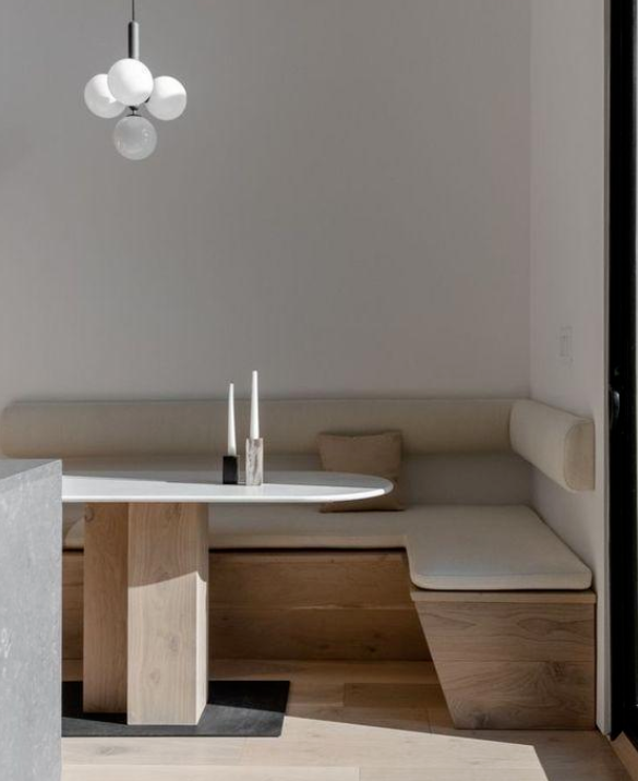 卡座靠背避免直上直下,同樣需要一定的傾斜角度,可定制軟墊靠背,除了美觀性強,也能保證墻面的干凈整潔,或者選用這種自帶角度的木質(zhì)靠背,冬天使用也不會過于冰冷。