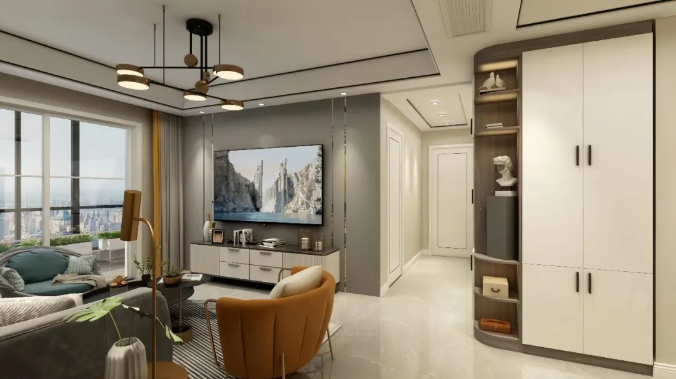 客廳背景墻的設(shè)計尤為精彩,通過護墻板與藝術(shù)畫的交錯搭配,形成了豐富的層次變化,電視墻更是采用了標(biāo)準(zhǔn)的懸掛設(shè)計,并配置有吊頂燈光,夜晚時分燈光傾瀉而出,瞬間提升整個空間的藝術(shù)氛圍。電視墻下方還設(shè)置了配套電視機柜,進一步強化了空間上的立體感。