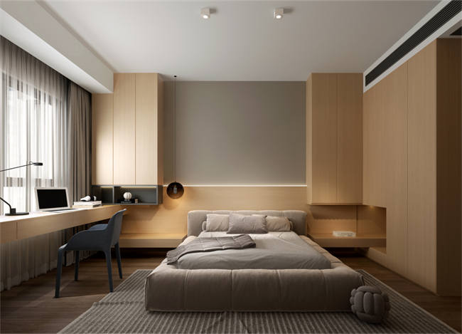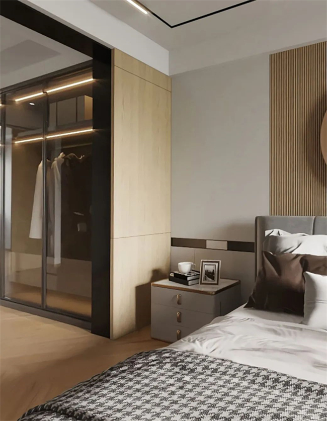3、衣柜做成立體式到頂?shù)臉邮?。不易落灰,更好打理柜門盡量不要用透明玻璃的,如果衣服太多從外面看起來(lái)就會(huì)很凌亂,影響美觀。