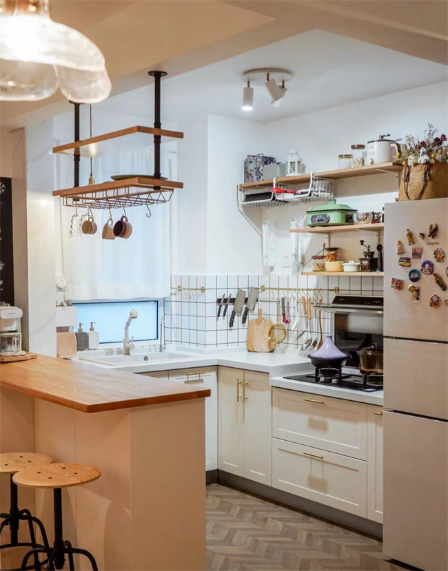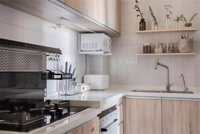 2、煙道處不做矮柜,改做高柜,裝上玻璃柜門擴(kuò)大儲(chǔ)物空間,廚房更整潔,更好打理。